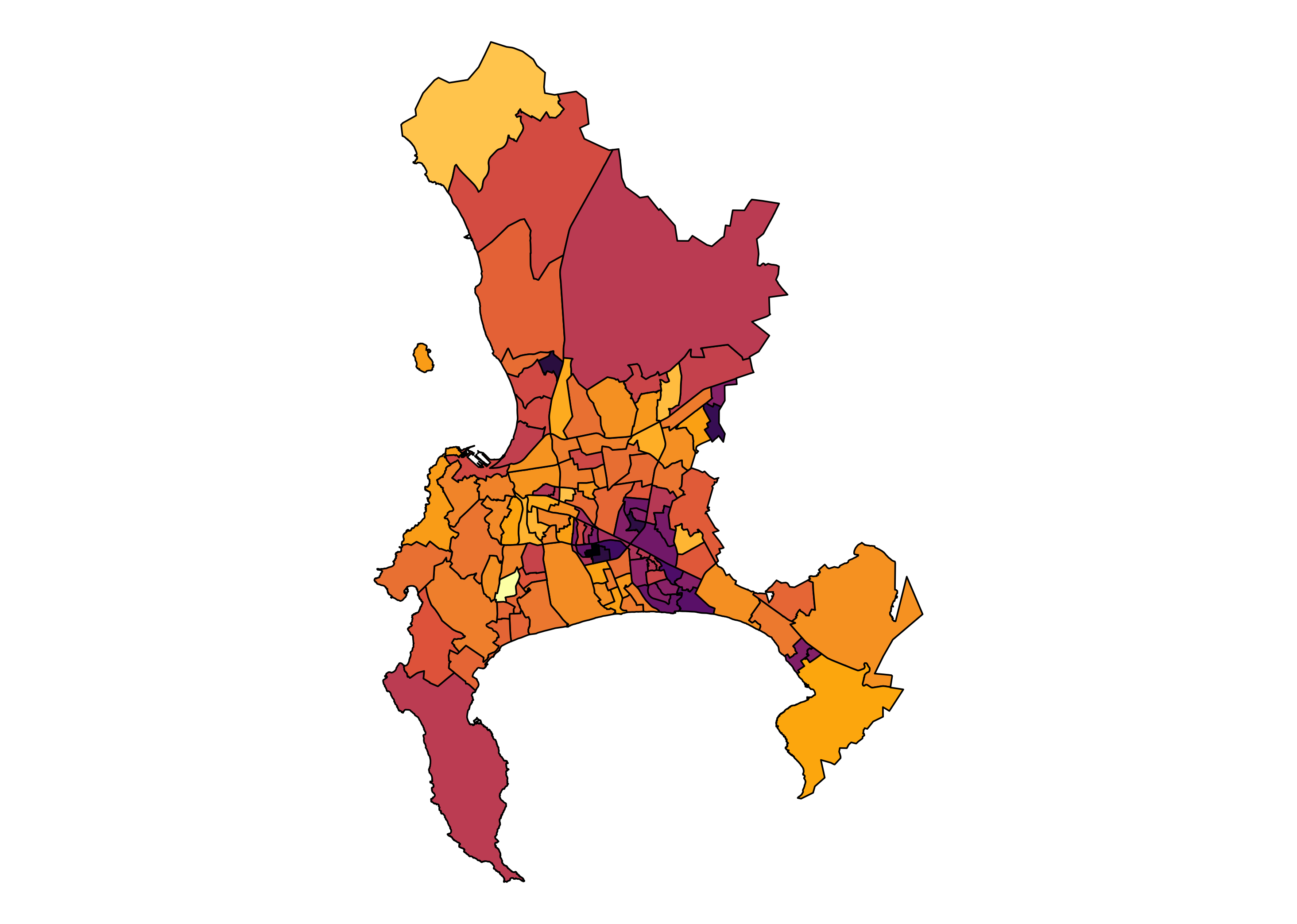 Figure 2 illustrates differences in turnout across five metropolitan municipalities. This approach provides a more granular view of outcomes while focusing on regions with higher population densities. Some distinct patterns emerge at a ward-level and metropolitan-level. One approach to quantifying these patterns is to do hotspot analysis. Effectively, we can rely on a number of statistics to assess spatial autocorrelation. Kopczewska (2021), pp. 149-211 provides a succinct summary of the spatial autocorrelation, global and local statistics and their visualisation.