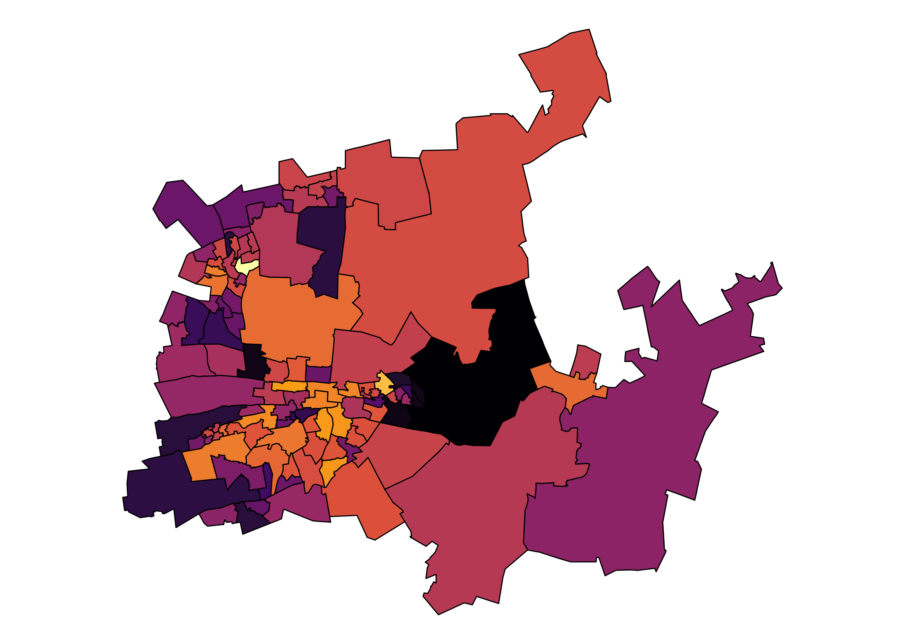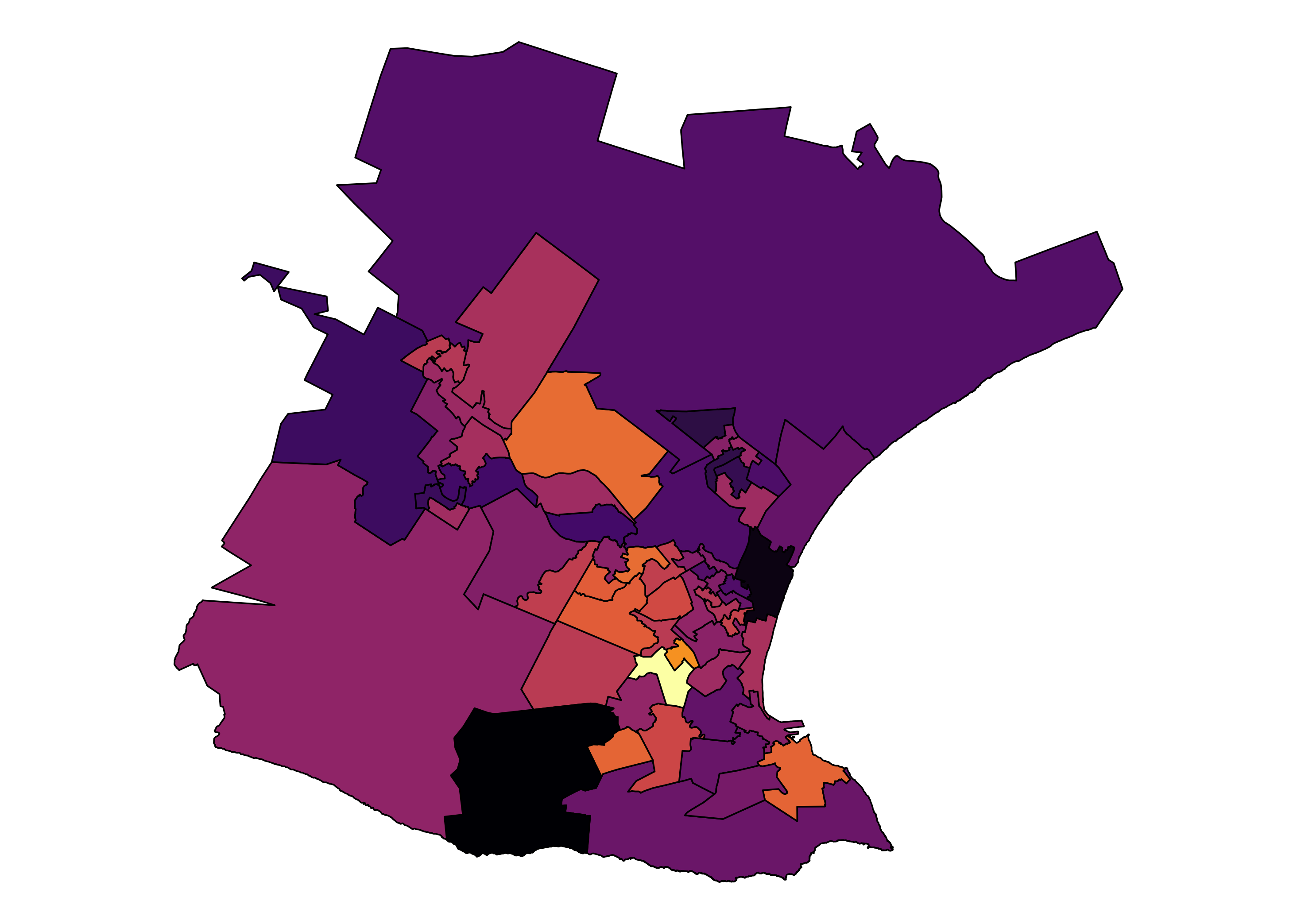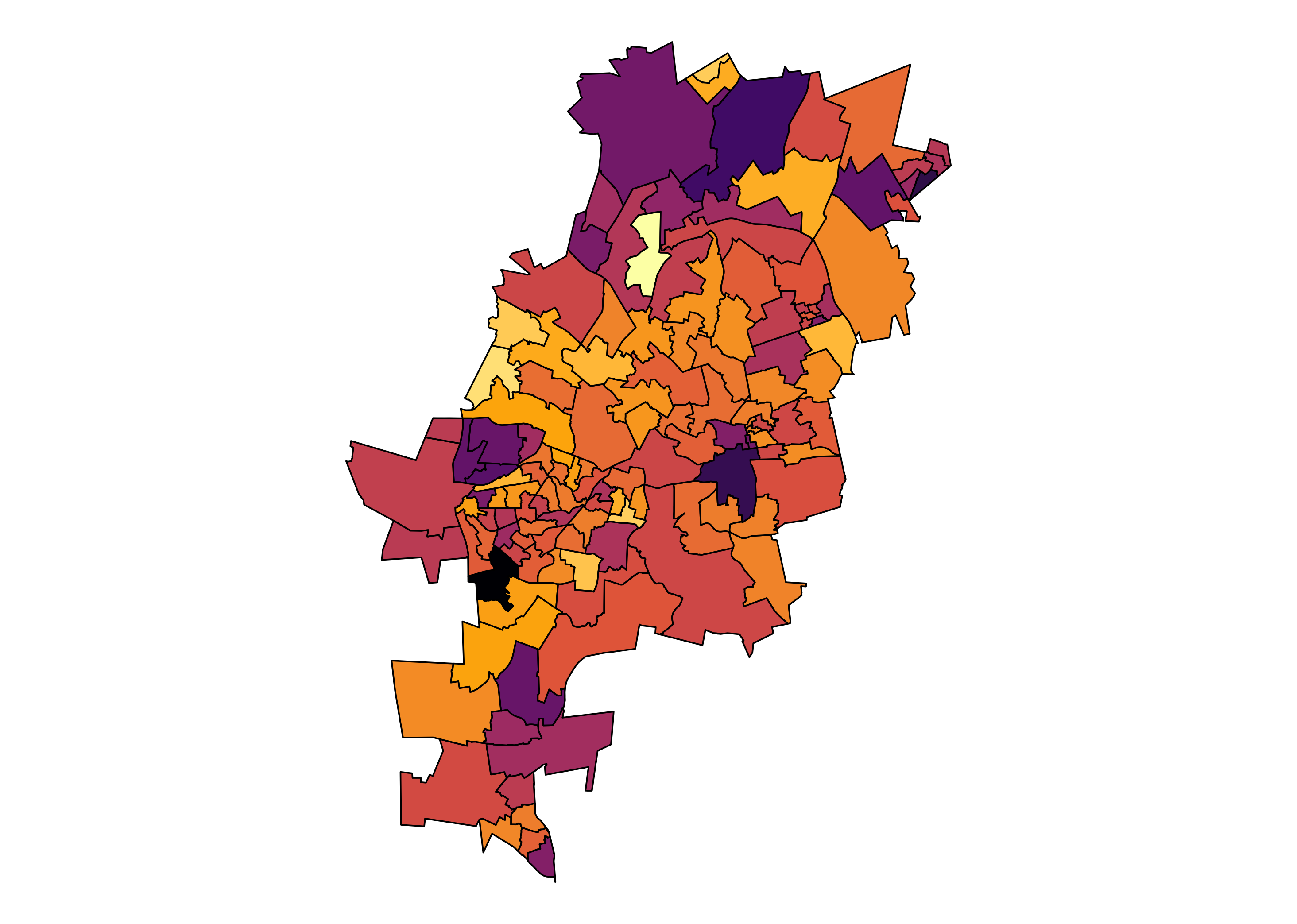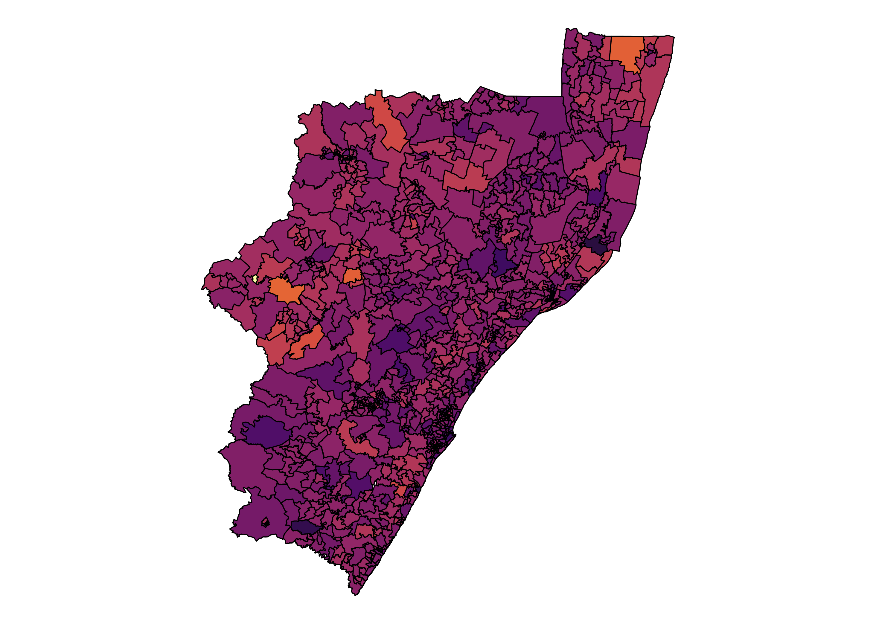 )Figure 1 illustrates the turn out differences across wards. There are at least 4454 wards, as a result, insights are lost in the noise. For example, the metropolitan areas are indistinguishable from the rest of the country, their differences are hidden by ward boundaries. It is possible to ‘zoom’ into these areas of interest.