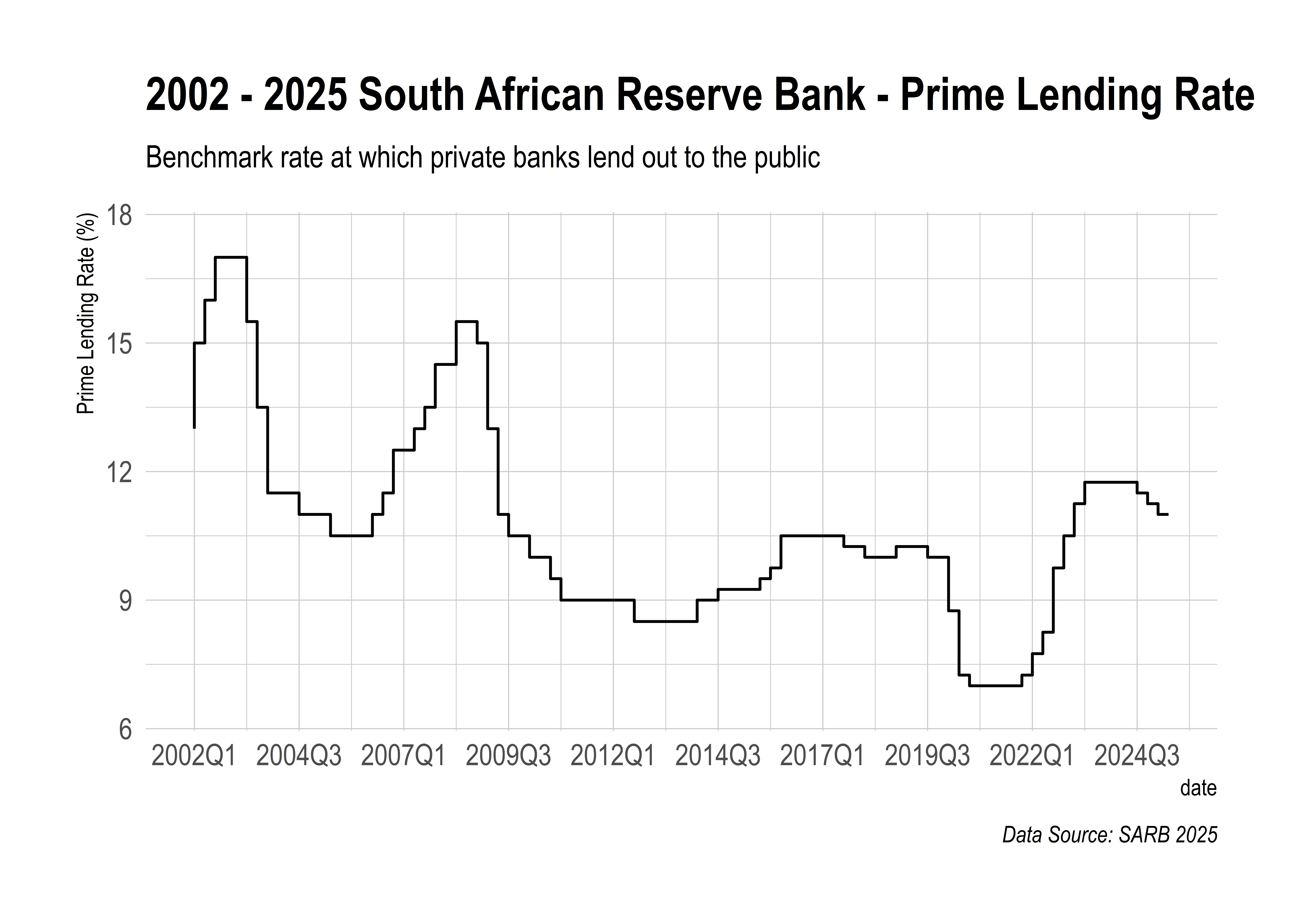 title = paste0("2002 - 2025 South African Reserve Bank - Prime Lending Rate"),